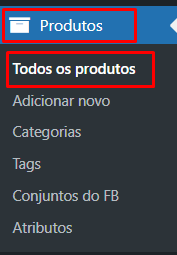 Utilizando o painel lateral, navegue até Produtos > Todos os produtos> Exportar/ Importar