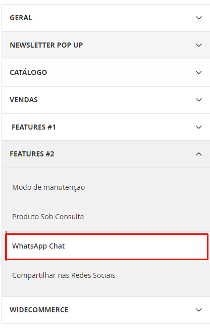 Utilizando o painel lateral, navegue até Lojas > configurações e procure pelo campo Features #2 e por Whatsapp chat