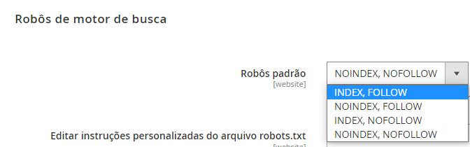 1 – Robôs padrão: Por padrão esta opção está marcada como NOINDEX, NOFOLLOW então altere a mesma para INDEX, FOLLOW