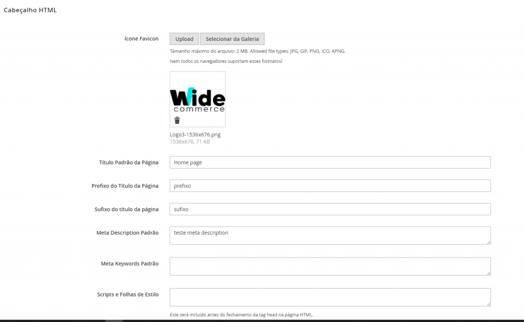 Para inserir as configurações, navegue até o campo “Cabeçalho HTML” e nesta pagina, encontrará os campos mencionados acima, preencha suas informações corretamente e salve as configurações