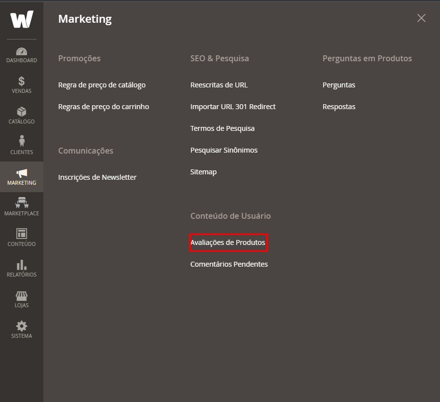 Para acessar os todos os comentários, navegue até Marketing > Conteúdo de Usuário > Avaliações de Produtos, uma lista com todos os comentários feitos na loja será exibida.