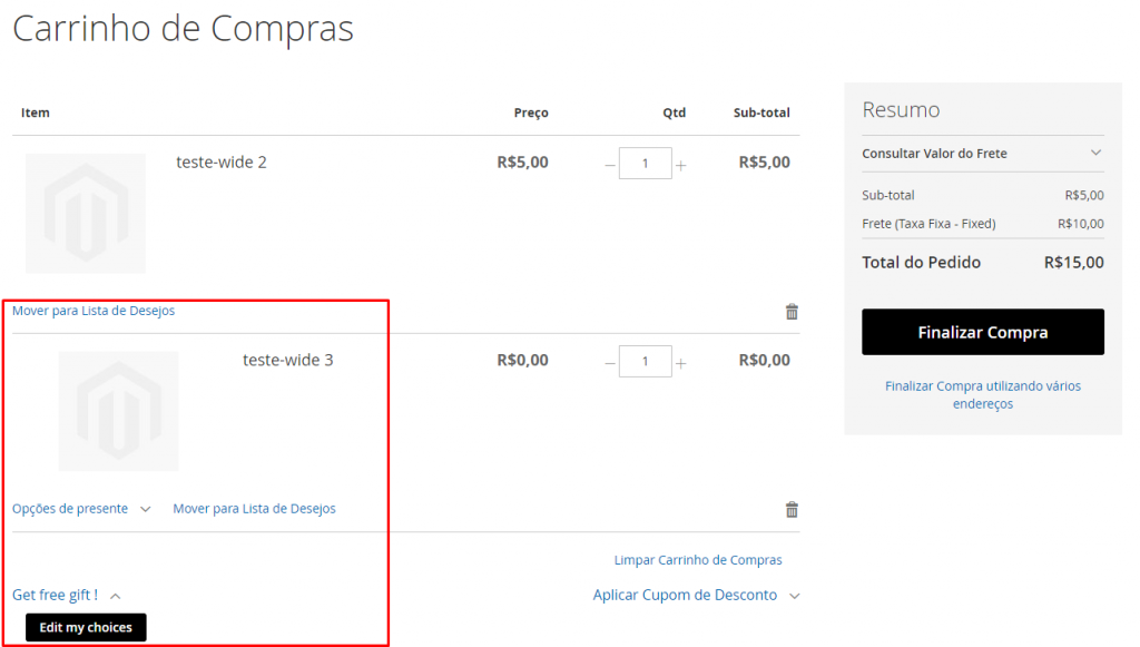 Ao adicionar o produto que ativa o brinde, o mesmo deve ser exibido no carrinho como mostra abaixo.
